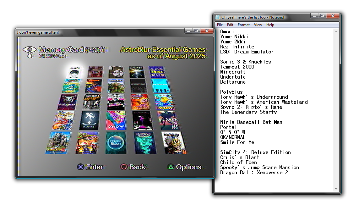 Noting I do not really game often, but uh. I guess I do have a pretty defined taste in...stuff,...you might be able to get an idea of the kind of video games I enjoy (typically) based on the list alone, if you're familiar with enough of them.Generally, it's either indies or older games (4th thru 6th generations) that I cater towards. I'm willing to give a lot of things a chance, I think.I'll make a Backloggd account eventually, but in the meantime my Steam page is relevant, I think.