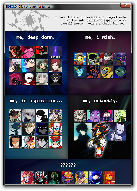That's a lot about me, but it's not everything. You're free to talk to me about the other shit I'm, less (I guess) willing to throw on a Carrd page if you message or @ me wherever you can I guess. I don't bite.