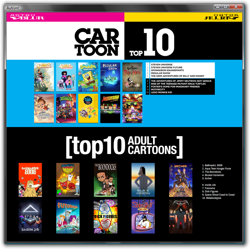 As I directly state in the very small text above the page title, I'm ...mostly into cartoons. American & Canadian TV productions & indies, or Japanese TV productions, predominantly. I do like live action shit additionally but I definitely do not incline toward that like I do with cartoon stuff.Film-wise...I've seen a more diverse category of flicks than TV shows, but I'm not really as into that as I am into TV stuff. Regarding genre though-it's I feel a lot easier for me to get ahold of and digest many different types of film than it is for TV shows?... Sort of.Regarding recommending me stuff to watch, I'm open-minded to genuinely anything regarding movies to look at, but regarding TV shows, I think it's best to take into consideration my biases when trying to put me onto shit, but you're still free to talk to me about whatever you want me to get into. Really, just go for anything, I guess.I will definitely say please push more anime shit my way generally, because as much as that type of stuff has genuinely been in my life for all of it, I somehow haven't really completed a lot of series yet, proper. (Same kind of goes for most western animation I like too, though...)