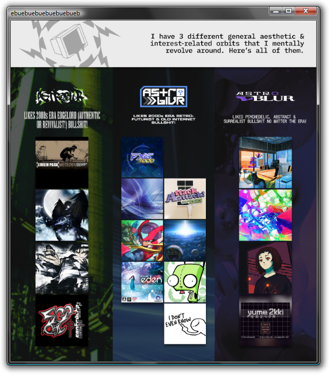Lot to me overall as a early zoomer but I think the big huge obvious thing is that I cater to 1990s & 2000s-era aesthetics, pretty predominantly, above other ones I find fascinating.